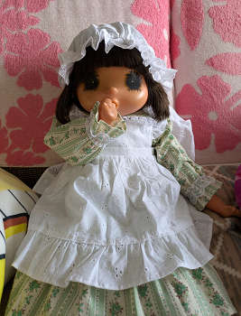 | 思えば、50年位前の物なので、古いお人形さんなんですが、新しいお人形さんに変身しました。 「ワンピ&エプロン」もすごく可愛らしいです。 (ワンピとお揃いのボンネットも作成できます) |